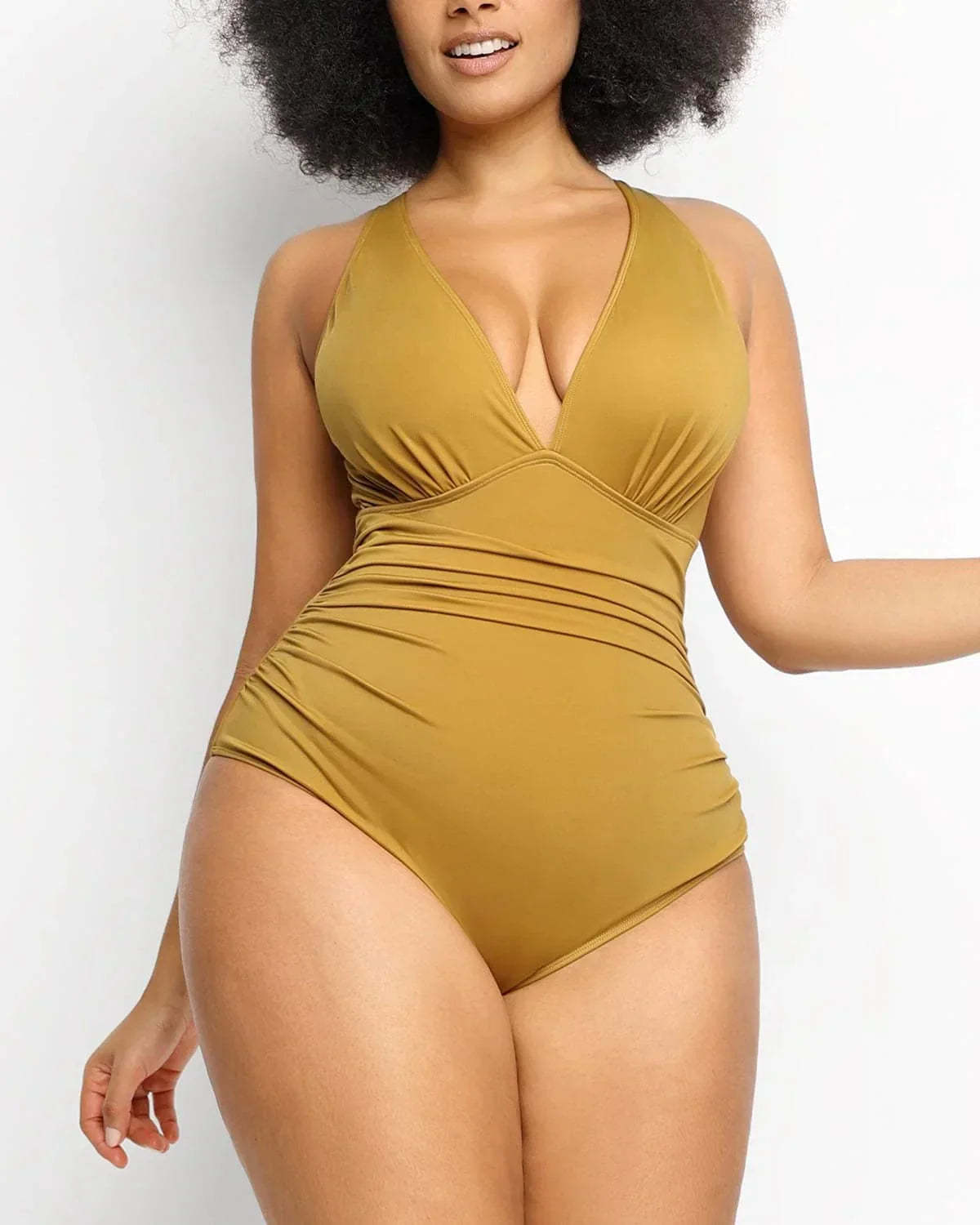 • Ruched front detailing enhances the hourglass shape.